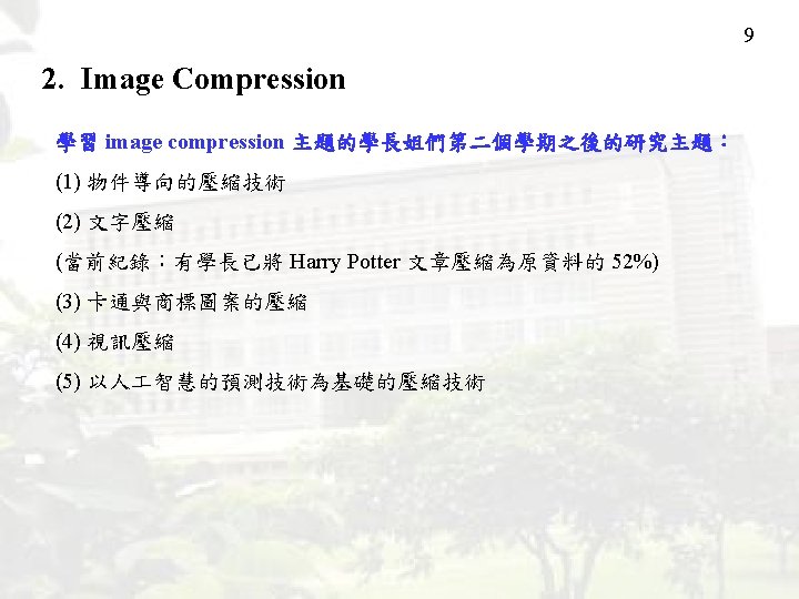 8 2. Image Compression 學期後幾週的進階研究 Entropy and Compression Arithmetic Coding Adaptive Arithmetic Coding