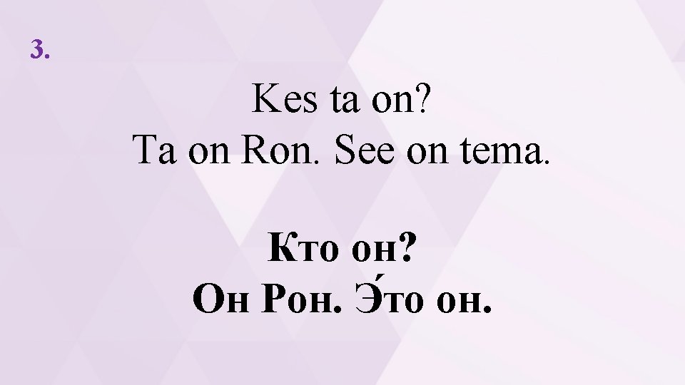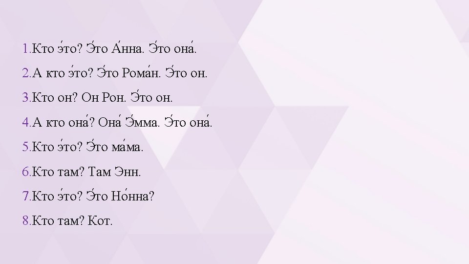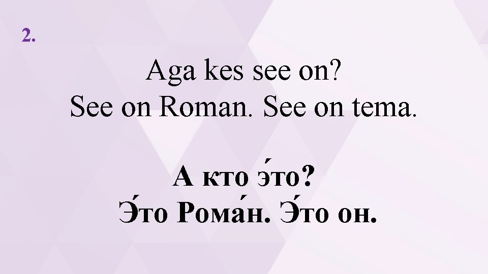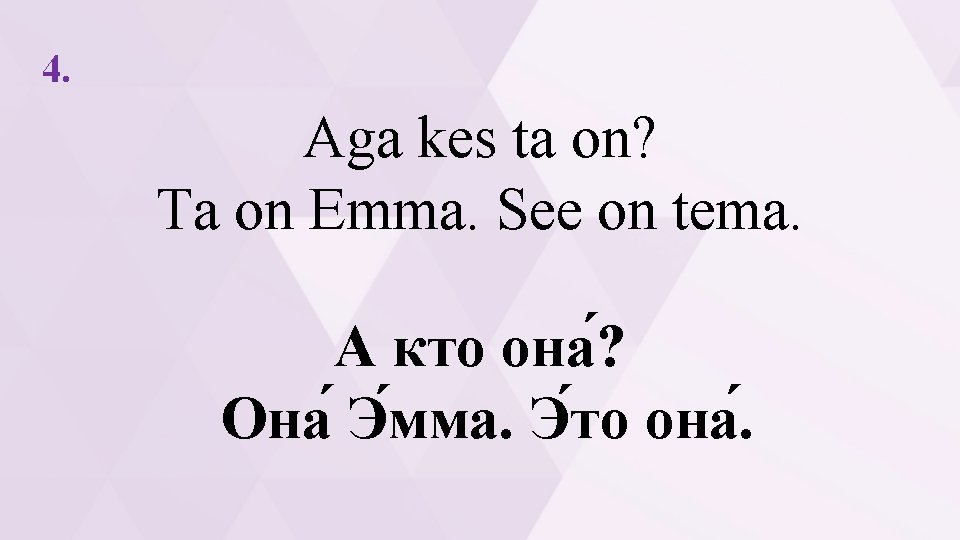 1. Kes see on? See on Anna. See on tema. 2. Aga kes see on? See on Roman. See on tema. 3. Kes ta on? Ta on Ron. See on tema. 4. Aga kes ta on? Ta on Emma. See on tema. 5. Kes see on? See on ema. 6. Kes seal on? Seal on Enn. 7. Kes see on? Kas see on Nonna? 8. Kes seal on? Kass.