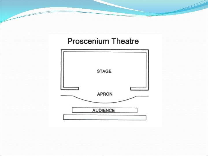 PROSCENIUM STAGE known as picture frame stage most commony used in the West the audience directly facing the stage typically raised several feet above front row audience level the main stage the space behind the proscenium arch, often marked by a curtain which can be lowered or drawn closed