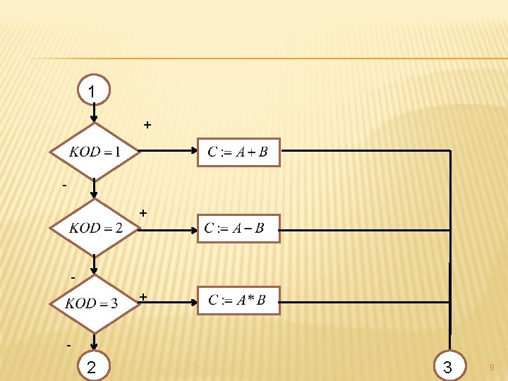 Začátek Zobraz: “Zadej 1 pro sčítání 2 pro odečítání 3 pro násobení 4 pro dělení“ Čti: KOD Čti: A, B 1 Jen se zobrazí na obrazovce, aby uživatel věděl, co se očekává. Do proměnné KOD se načte kód, zjistí se jaká operace se bude dělat. Čísla, se kterými se budou provádět jednotlivé operace. 8