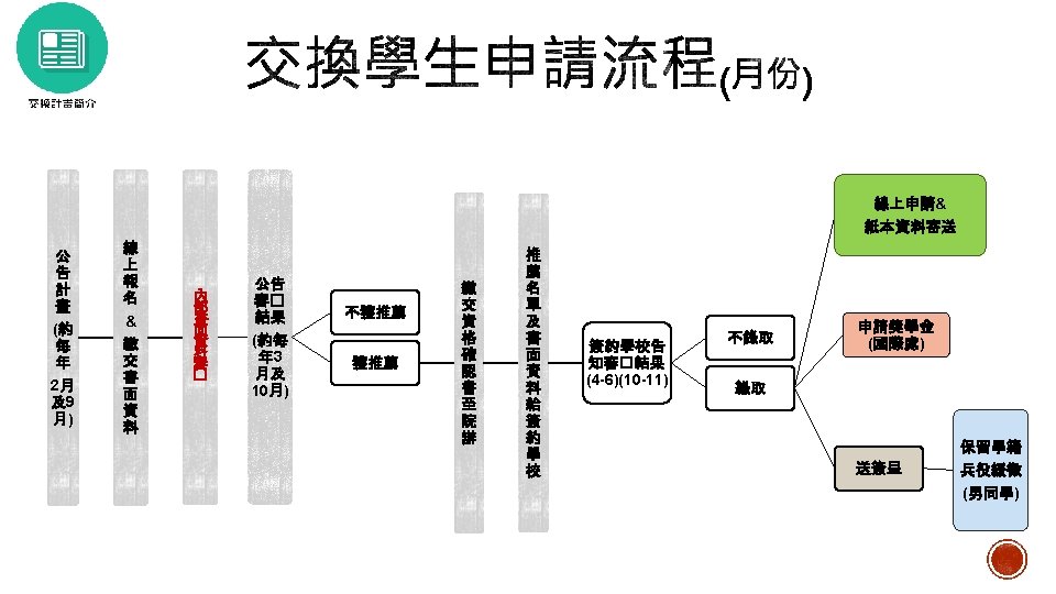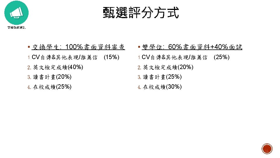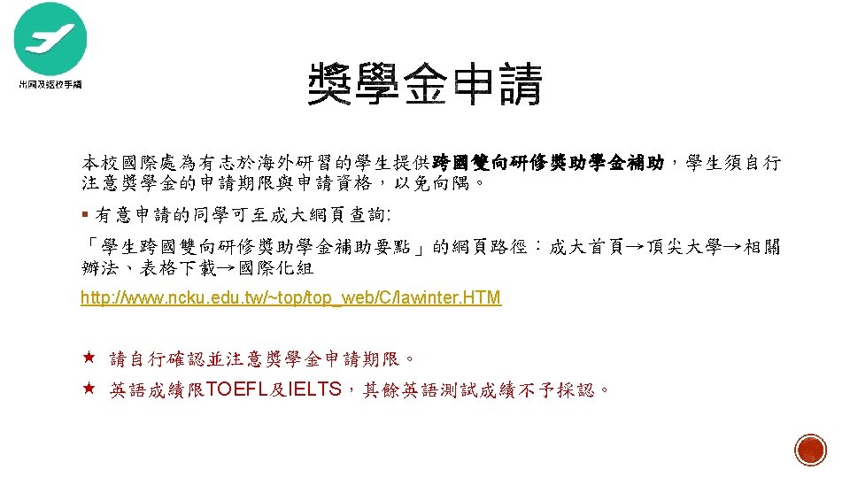 交換學校 日本大阪大學 The Graduate School of Economics Osaka University 英語能力要求 JPLT N 1 (Japanese) or TOEFL IBT 80 or IELTS 6. 0 *自 2017 -2018學年起,只開放上學期(秋季)申請入學。 中國南開大學商學院 Business School of Nankai University Mandarin, IELTS 6. 0 中國北京交通大學 Beijing Jiaotong University Mandarin, HSK 4 and above for international students or native language IELTS 5. 5 for English taught courses 香港城市大學 City University of Hong Kong TOEFL score ≥ 79 (on the Internet-based test), IELTS overall band score ≥ 6. 5, or Chinese Mainland's 香港理 大學 The Hong Kong Polytechnic University TOEFL: 80; Paper based=550; IELTS Academic 6. 0 *只接受大學部同學申請。 *合作學校擁有修改甄選資格之權利。
