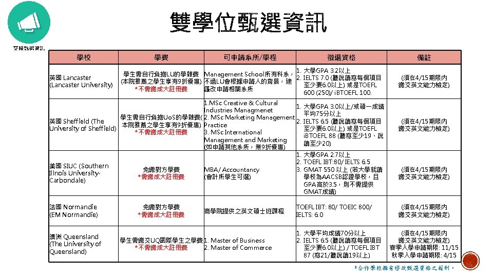 § 雙聯學位計畫: 1. 英國蘭卡斯特大學 (Lancaster University) 2. 英國雪菲爾大學 (The University of Sheffield) 3. 美國南伊利諾大學 (Southern Illnois University-Carbondale) 4. 法國諾曼第大學 (EM Normandie) 5. 澳洲昆士蘭大學 (The University of Queensland) 6. 法國雷恩商學院 (ESC Rennes School of Business)(2017新增) § 交換學生計畫: 1. 法國諾曼地商學院 (Ecole de Management de Normandie) 2. 法國電信學院 (Telecom Ecole de Management) 3. 法國雷恩商學院 (ESC Rennes School of Business) 4. 法國南希商學院 (ICN Business School Nancy-Metz) 5. 法國IPAG商學院 (Ipag Business School)