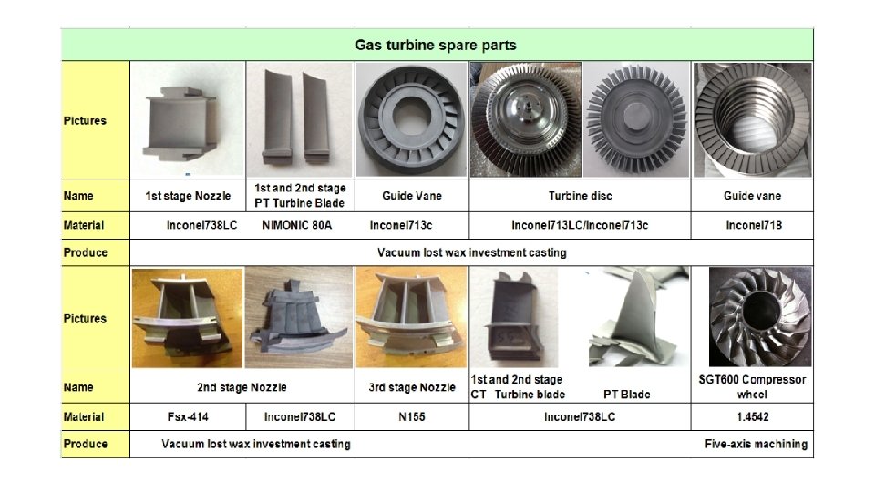COMPONENT BUCKETS U 500 Ni Co Mo Ti Al RENE 77 (U 700) 18. 5 15 BAL 18. 5 17 4 5. 3 3 3. 35 3 4. 25 IN 738 16 BAL 8. 3 0. 2 2. 6 1. 75 3. 4 GTD 111 14 BAL 9. 5 3. 8 1. 5 4. 9 3. 0 X 45 25 25 10 10 BAL 1 1 FSX 414 28 10 BAL N 155 21 20 20 GTD-222 22. 5 BAL 19 23 22 20 22 13 BAL 22 BAL 18. 5 37. 0 3. 0 ALLOY 706 19 16 Cr-Mo-V A 286 1 15 0. 5 25 BAL 1. 25 1. 2 M 152 12 2. 5 BAL 1. 7 NOZZLES X 40 COMBUSTORS SS 309 HAST X N-263 HA-188 TURBINE WHEELS ALLOY 718 COMPRESSOR BLADES AISI 403 + Cb GTD-450 Cr High-Temperature Alloys 12 12 15. 5 1. 5 20 BAL Fe C B 0. 07 0. 006 0. 02 0. 10 0. 001 1. 75 0. 10 0. 01 2. 8 8 8 0. 50 0. 25 0. 01 1 7 0. 25 0. 01 BAL 2. 5 3 2. 0 2. 3 BAL 1. 9 0. 4 1. 5 W 0. 7 BAL V 0. 9 0. 20 1. 2 0. 8 0. 10 9 6 14. 0 BAL 6. 3 Cb 2. 1 0. 4 0. 9 1. 8 0. 5 2 5. 1 2. 9 0. 3 0. 2 0. 8 0. 008 1. 00 0. 10 0. 07 0. 06 0. 05 0. 01 0. 03 0. 25 0. 30 0. 08 0. 3 0. 12 0. 11 0. 15 0. 03 0. 006 Ta