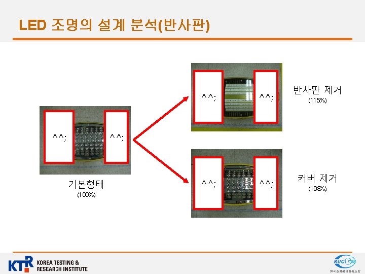 형광등 vs LED램프 형광등기구 (FLR 32 W X 8등용) LED등기구 (LED 22 W X 8등용) Uniformity(g 1) : 0. 58 Uniformity(g 1) : 0. 57 Uniformity(g 2) : 0. 42 Uniformity(g 2) : 0. 37