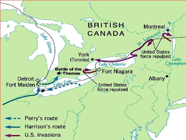 “Mr. Madison’s War” n June, 1812: War Hawks engineer declaration of war with England. n n n Unfortunately, Congress was not aware that London repealed impressment policy 2 days prior to war New England opposed to war but Southern/western states supported the war US at war vs. most powerful nation, but US divided Poorly equipped US army initiated military action in 1812 by launching a 3 -part invasion of Canada The British easily repulsed the Americans