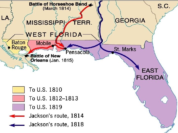 New orleans • 10, 000 British troops reached the mouth of the Mississippi River and were threatening the Louisiana Purchase. • 4, 500 U. S. troops led by Andrew Jackson, the British were defeated on January 8, 1815, 2 weeks after the Treaty of Ghent was negotiated to end the war.