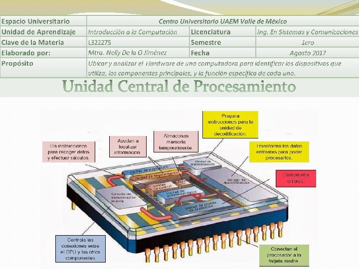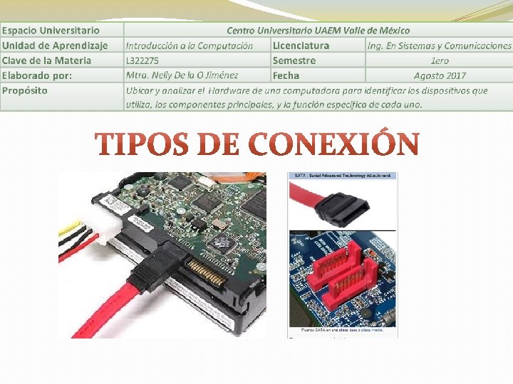 El material está elaborado como apoyo a clase presencial, el objetivo es cubrir el Tema: HARDWARE Cada subtema esta desarrollado con Actividades; para generar aprendizaje sginficativo, que aporten al proceso de E-A Características de la Presentación: Cada diapositiva esta divida en secciones que se detallan a continuación: Cuadro de color: Corresponde al encabezado de la unidad de aprendizaje 6