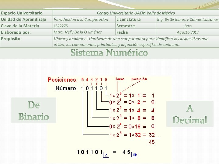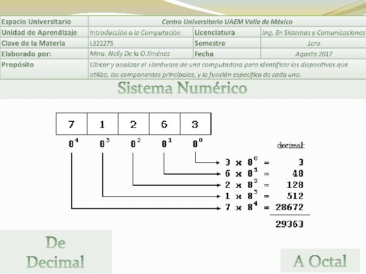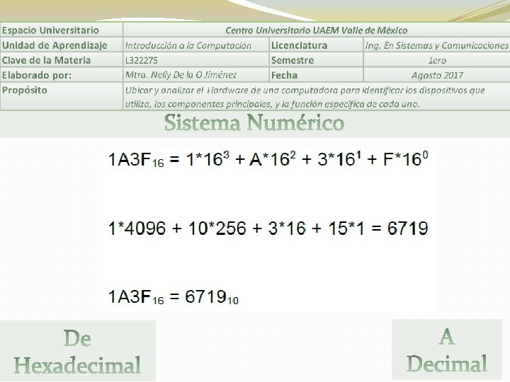 Se le llama sistema de numeración a un conjunto de símbolos y reglas que son utilizan para la representación de datos numéricos y cantidades. Estos se caracterizan por su base. . Ejemplos de sistemas numéricos: Decimal, binario, octal, hexadecimal.