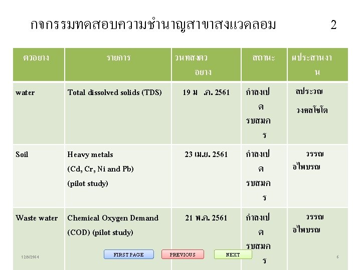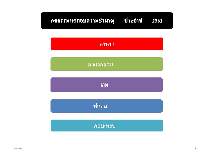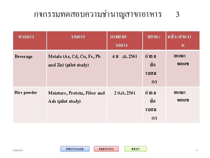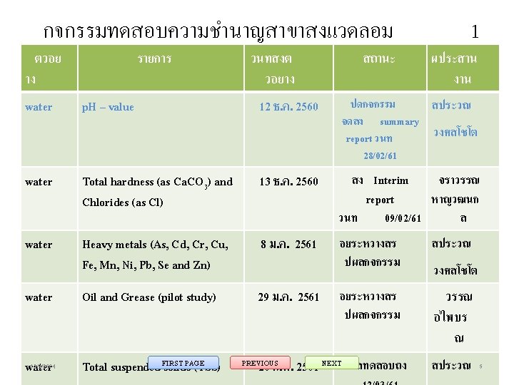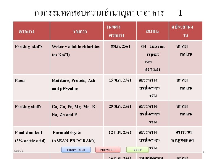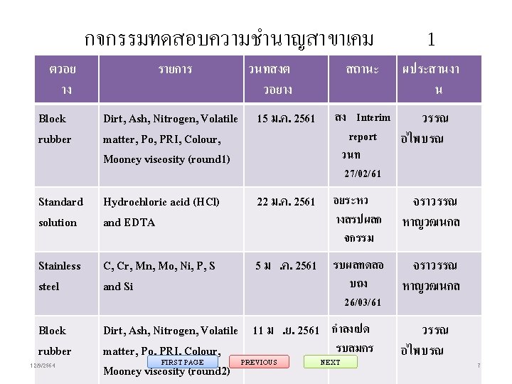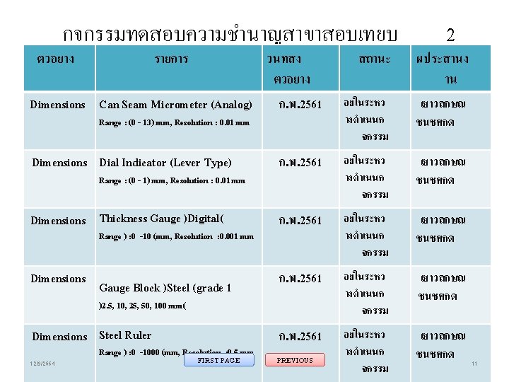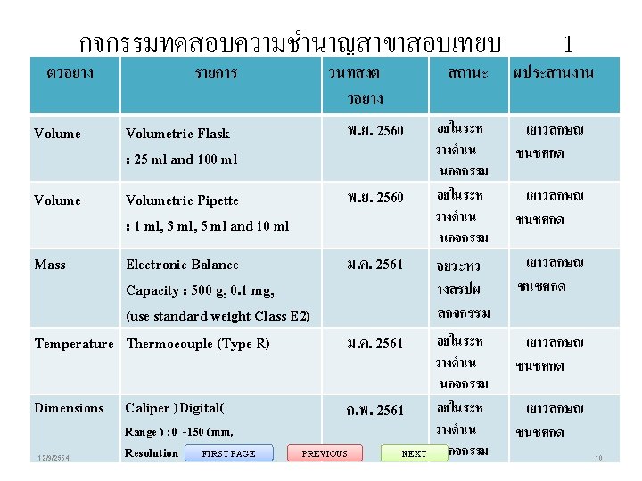 1 Medical glove Dimensions Thickness 27 2561 Width Slides: 11 Download presentation กจกรรมทดสอบความชำนาญสาขาฟสกส ตวอยาง รายการ วนทสงต วอยาง สถานะ 1 ผประสานงา น Medical glove Dimensions (Thickness, 27 ก. พ. 2561 รบผลทด จราวรรณ Width and Length), สอบถง 13 หาญวฒนกล Force at break, Tensile /03/61 strength at break, Elongation at break and Watertightness Rubber Hardness 23 เม. ย. 2561 กำลงเป จราวรรณ Range: 20 - 90 Type A @ 23ºC ด หาญวฒนกล รบสมค ร Steel bar Maximum force, Yield force, 30 เม. ย. 2561 กำลงเป จราวรรณ Yield strength, ด หาญวฒนกล Tensile strength, Elongation. PREVIOUS NEXT รบสมค FIRST PAGE 12/9/2564 and Reduction of area ร 8 กจกรรมทดสอบความชำนาญสาขาฟสกส ตวอยาง รายการ Paper Ring crush resistance )machine direction(, Bursting strength, Grammage and Thickness Plastic Tensile strength, Elongation at break and Melt flow rate )pilot study( Range - 100) : 1000 (N 12/9/2564 FIRST PAGE วนทสงต วอยาง สถานะ 15พ. ค. 2561 กำลงเป ด รบสมค ร 5ม. ย. 2561 กำลงเป ด รบสมค ร PREVIOUS NEXT 2 ผประสานงา น จราวรรณ หาญวฒนกล 9
