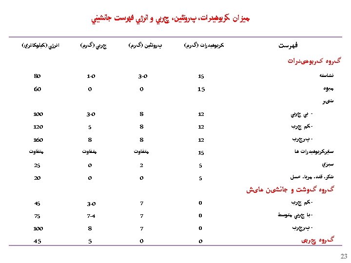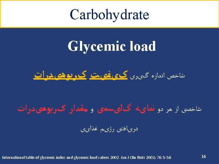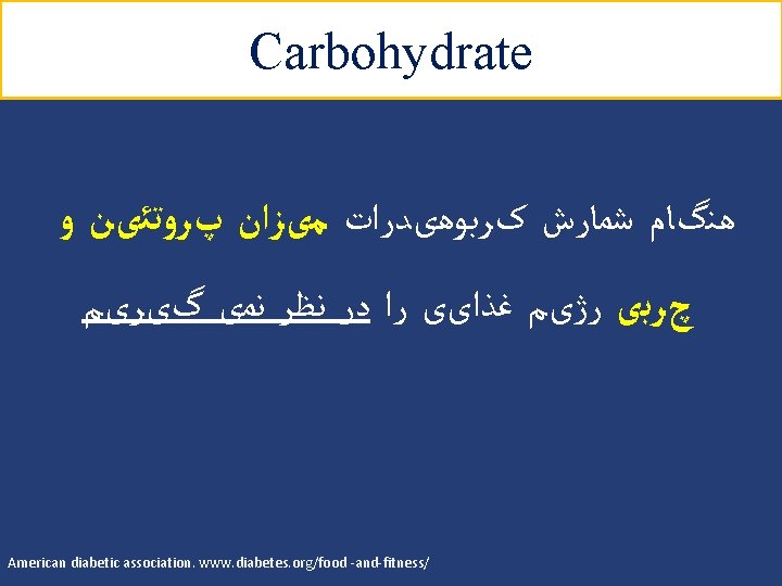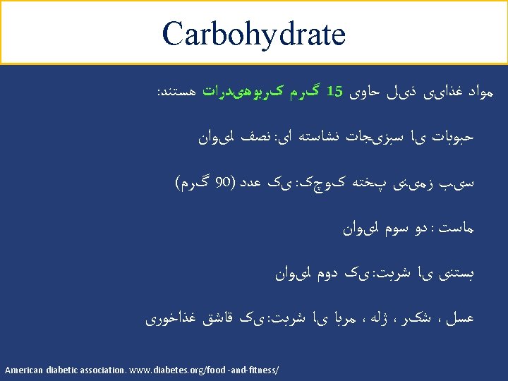 Carbohydrate ﺑﺎﺭ گﻠیﺴﻤی ﻭ ﻧﻤﺎیﻪ گﻠیﺴﻤی ü 2 ﺍﺭﺗﺒﺎﻁ ﻣﺜﺒﺖ ﺑﺎ ﺑﺮﻭﺯ ﺩیﺎﺑﺖ ﻧﻮﻉ § ﺍﺭﺗﺒﺎﻁ ﻣﺜﺒﺖ ﺑﺎ ﺑﺮﻭﺯ چﺎﻗی § HBA 1 C ﺍﺭﺗﺒﺎﻁ ﻣﺜﺒﺖ ﺑﺎ ﻏﻠﻈﺖ § Low glycemic index diets in the management of diabetes. Diabetes care 2003; 26 (8) Glucemic index, glycemic load, and chronic diesease risk-a meta-analysis of observational studies. AJCN 2008; 87: 627 -37. 18