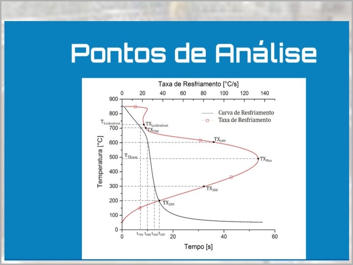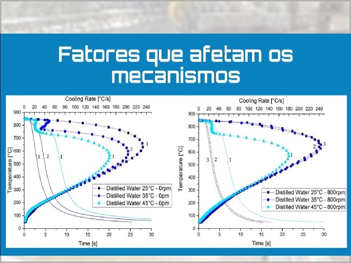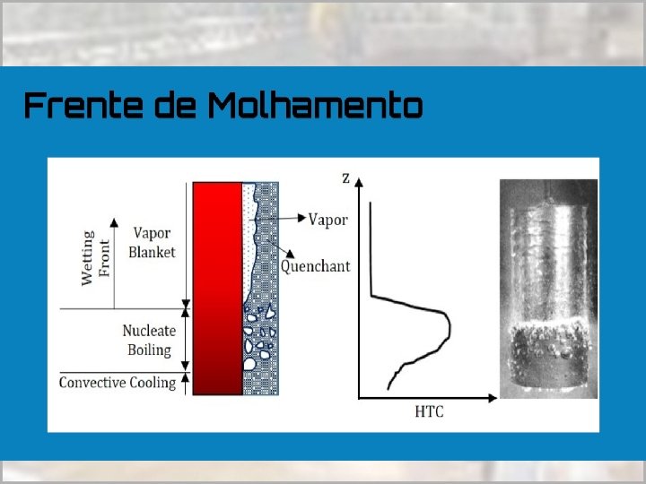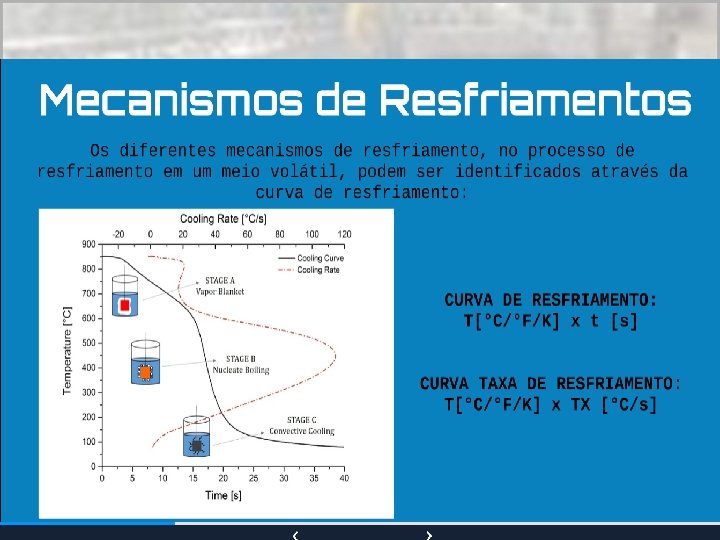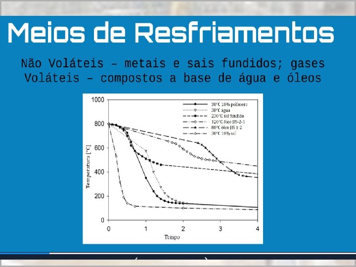 Estágios de Resfriamento • A têmpera em um meio líquido pode ocorrer em três estágios: • 1 o Estágio: quando o aço é introduzido forma-se uma camada de vapor que rodeia o metal e o resfriamento se faz por condução e radiação através da camada gasosa • 2 o Estágio: A película de vapor vai desaparecendo e dando lugar à formação e desprendimento de bolhas • 3 o Estágio: resfriamento se dá por condução e convecção. Durante estágio ocorre a transformação martensítica