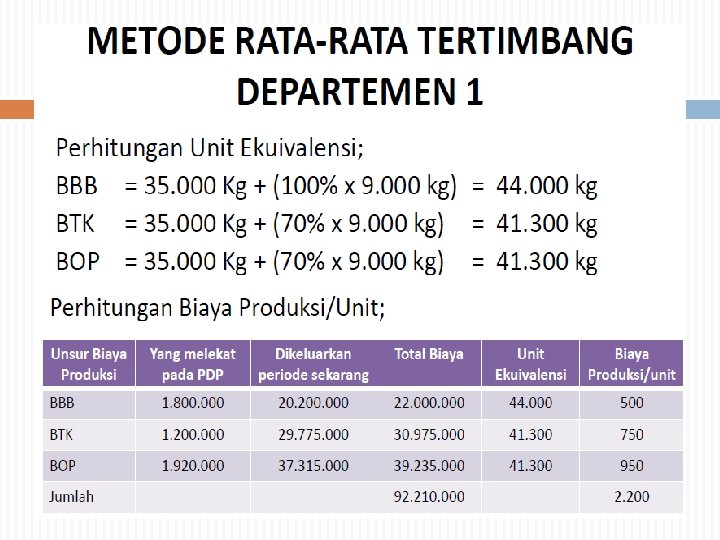 Metode Harga Pokok Rata-rata (Weighted Average) Dihitung total biaya untuk masing-masing jenis biaya produksi, yaitu : biaya bahan, biaya tenaga kerja, dan biaya overhead pabrik dengan cara biaya yang melekat pada persediaan barang dalam proses awal ditambah biaya-biaya periode berjalan. Dihitung jumlah unit ekuivalen produksi yang dihasilkan dalam periode yang bersangkutan : Barang jadi (yang ditransfer ke departemen berikutnya) ditambah barang dalam proses akhir menurut unit ekuivalen. Harga pokok rata-rata kemudian dihitung berdasarkan total biaya dibagi jumlah unit ekuivalen.