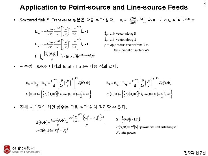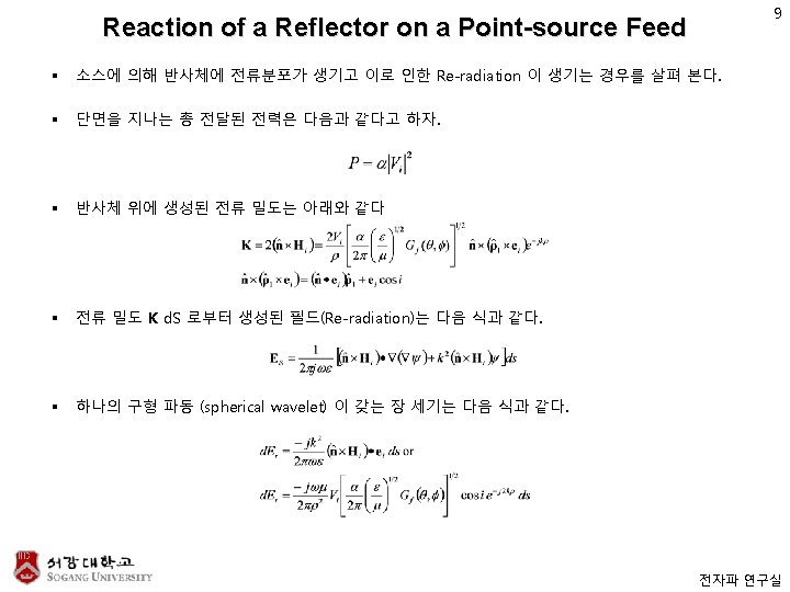 Application to Point-source and Line-source Feeds § Longitudinally polarized source의 경우, scattered field는 아래와 같다. § transversely polarized source의 경우, scattered field는 아래와 같다. § 직각좌표계에서 구형좌표계로 다음과 같이 식을 바꿀 수 있다. 8 전자파 연구실