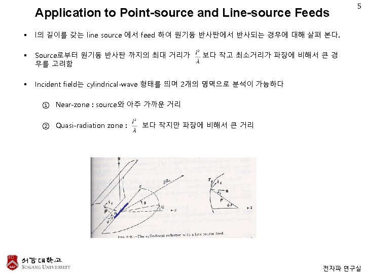 목차 • • 2 5. 9. Application to Point-source and Line-source Feeds 5. 10 Reaction of a Reflector on a Point source Feeds 5. 11 The Aperture-field Method 5. 12 The Fraunhofer Region 5. 13 General Considerations on the Approximate Methods 5. 14 Reduction to a Scalar Diffraction Problem 5. 15 Babinet’s Principle for the Electromagnetic Field 전자파 연구실