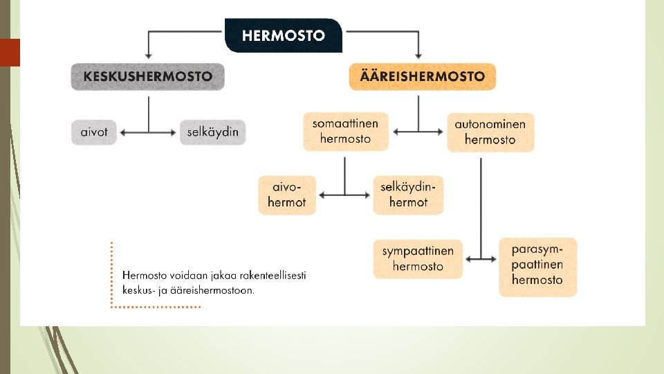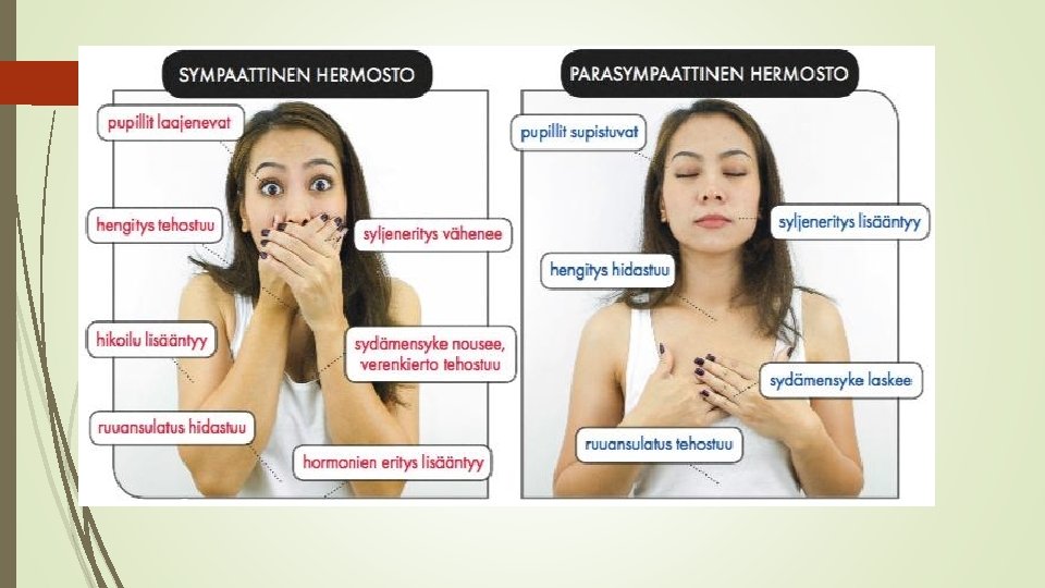 Tunteet kehossa autonominen hermosto: liittyy tunteiden kehollisten reaktioiden syntymiseen autonomisen hermoston muodostavat sympaattinen ja parasympaattinen hermosto sympaattinen hermosto: nostaa elimistön vireystasoa, lisää stressihormonien erittymistä verenkiertoon parasympaattinen hermosto: aktiivinen lepotilassa, kun elimistö palautuu rasituksesta ja täydentää energiavarastojaan autonominen hermosto tärkeä nopeiden tunnereaktioiden yhteydessä → voi käynnistyä ennen tietoista kokemusta reaktion aiheuttajasta taistele tai pakene -reaktio: sympaattisen hermoston toiminta kiihdyttää elimistön valmiustilaan nopeana reaktiona