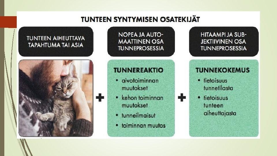 Tunteen määrittely tunne eli emootio: lyhytkestoinen kehon ja mielen tila, joka tuottaa yleensä jonkinlaisen mielihyvän tai mielipahan sävyttämän tuntemuksen tunteiden kokemisen voi aiheuttaa ulkoinen kohde, esim. ruoka, sosiaalinen tilanne ajatukset ja muistot tunteilla psyykkinen taso, biologinen taso ja sosiaalinen taso mieliala: tunnetta pitkäkestoisempi taipumus kokea tietyntyyppisiä tunteita