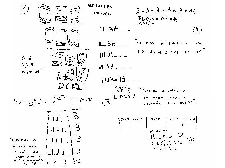 Reparto equitativo • “Para la biblioteca del aula juntamos 15 libros. Tenemos que acomodarlos en 5 estantes y que en todos los estantes haya la misma cantidad de libros ¿Cuántos libros pondremos en cada uno? ” A continuación se puede observar procesos de resolución de niños de 1º grado