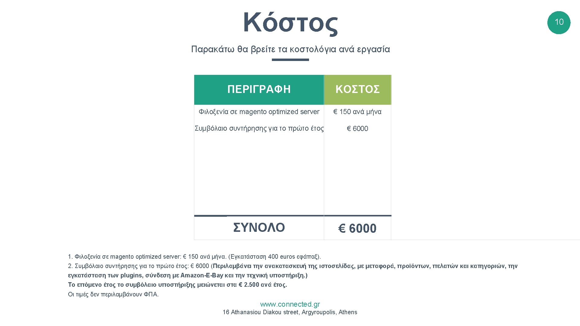 Χρονοδιάγραμμα 9 Παρακάτω θα βρείτε το χρονοδιάγραμμα των εργασιών 2017 -2018 1 2 3 4 5 6 7 8 9 10 11 12 13 14 15 16 17 18 19 20 21 22 23 24 25 26 27 28 Σύνδεση με Amazon / E-Bay January February March April May June July August September October November December Εναρξη έργου – Μεταφορά παλαιού site Δημιουργία νέας σελίδας και εγκατάσταση plugins Γραφιστικό μέρος Έλεγχος καλής λειτουργίας και Launch καταστήματος www. connected. gr 16 Athanasiou Diakou street, Argyroupolis, Athens 29 30 31