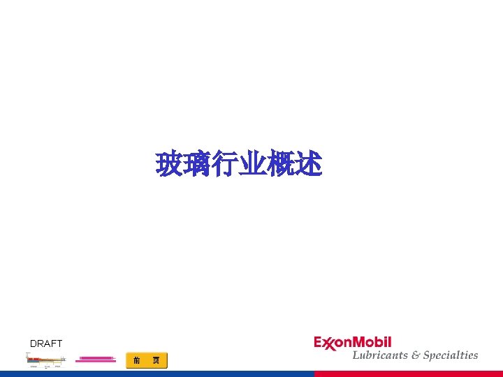 玻璃生产设备润滑(1) n 喂料装置齿轮箱、轴承 Mobil SHC 634 Mobilgear 634 n 剪料机 Mobil Glass Shear 67 AT Mobilgear 634 Mobilgear SHC 3200 Mobilgrease XHP 222 剪刀 传动装置 n 输送辊道 n 制瓶机 DRAFT Mobilith SHC 460 液压系统 润滑系统 Mobil DTE 20 Series Mobil SHC 634 Mobilgear 634