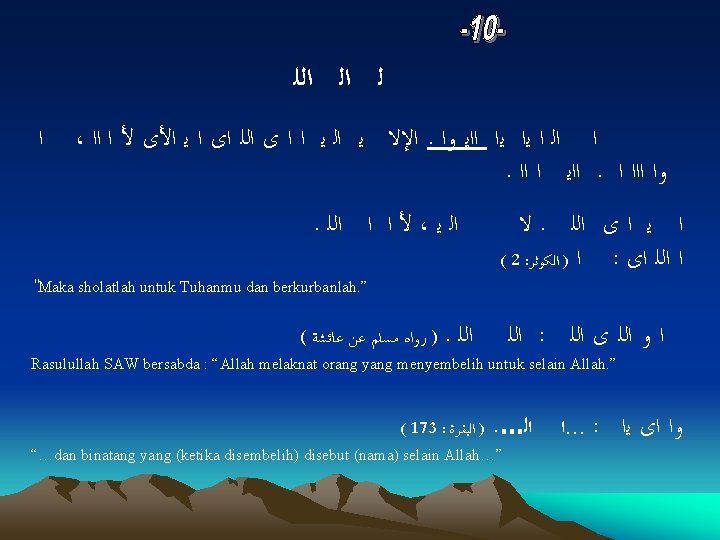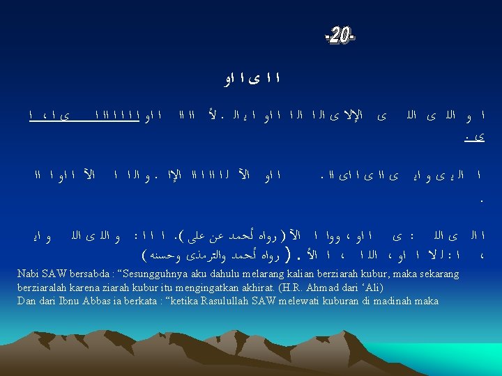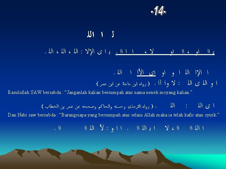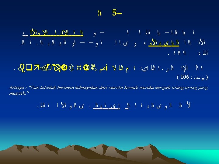 ( 48 : ﺍ ﻭ ﺍ ) ﺍﻟﻨﺴﺎﺀ –ﻟ 2 ﺍﻟ ﺍ : ﺍ ﺍﻟﻠ ﺍﻯ. ﺍﻟ ﺍﻟ ﻭ ﺍﻯ ﻻ ﺍﻟﻠ ﺍ ﻻ ﺍ ﺍﻟﻠ ، ﻟ ﺍﻟ ﻳ Artinya : Sesungguhnya Allah tidak akan mengampuni dosa syirik, tetapi Dia mengampuni segala dosa selain (syirik) itu bagi siapapun yang ia kehendaki. ” ( ) ﺭﻭﺍﻩ ﻣﺴﻠﻢ ﻋﻦ ﺟﺎﺑﺮ. ﺍﻟ ﺍ ﺍ . ﺍﻟﻠ ﻻ ﺍ ﺍ : ﺍ ﻭ ﺍﻟﻠ ﻯ ﺍﻟﻠ Artinya : Barang siapa yang menemui Allah (mati) dalam keadaan tidak berbuat syirik kepada -Nya sedikit pun, pasti masuk surga; tetapi barangsiapa menemuinya (mati) dalam keadaan berbuat sesuatu syirik kepada-Nya, pasti masuk syirik. ” ). ﺍﻷﺍ ﺍﻱ : ﺍ ﺍﻟﻠ ﺍﻯ ﺍ ﺍﻩ ﻳ ﺍﻟ ﻻ. ﺍﻟﻠ ﺍﻳ ﺍﻟ ﻻ. ﻻ ﺍﻭ ﻯ ﺍﻟ ( 35 : ﺇﺑﺮﺍﻫﻴﻢ Artinya : “Dan jauhkanlah aku beserta anak cucuku dari menyembah berhala-berhala. ”