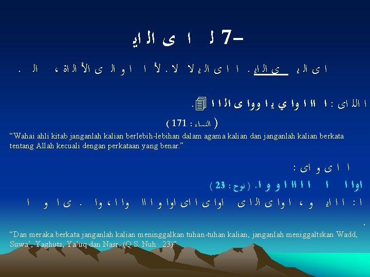ﻭ ﺍﻟ ﻯ ﺍﻷ 4. ﺍ ﺍﻟ ﻯ ﺍﻷ ﺍﺍ ﺍ ﻯ ﺍﻷ ( 51 : ﺍﻟﻨﺴﺎﺀ ) ﻯ ﺍﻳ ﻭﻭﺍ ﻳﺍ ﺍﺍ ﻭ ﺍ ﺍﻟ ﺍﻭ : ﺍ ﺍﻟﻠ ﺍﻯ Artinya : Apakah engkau tidak memperhatikan orang-orang yang diberi sebagian dari Al – kitab ? , mereka percaya kepada jibt dan thaghut, dan mengatakan kepada orang-orang kafir (musyrik Mekah), bahwa mereka itu lebih benar jalannya dari orang-orang yang beriman. ” ﻯ ﻭﺍ. ﺍ ﺍ ﺍ : ﺍ ﻭ ﺍﻟﻠ ﻯ ﺍﻟﻠ ( ؟ ) ﺭﻭﺍﻩ ﺍﻟﺒﺨﺎﺭﻯ ﻭﻣﺴﻠﻢ ﻋﻦ ﺃﺒﻰ ﺳﻌﻴﺪ ﺍﻟﺨﺪﺭﻯ : ﻭ ﺍﻟ ﺍﻯ ؟ ﺍ ، ﺍ ﻭ ﺍﻟﻠ : ﺍﻭﺍ. ﻭ Rasululllah saw bersabda : “Sungguh kalian akan benar-benar mengikuti kebiasaan-kebiasaan orang sebelum kalian selangkah demi selangkah sampai jika mereka masuk ke liang biawak maka kalian akan memasukinya. Mereka berkata : Wahai Rasulullah, apakah yang engkau maksud itu adalah orang-orang Yahudi dan Nasrhani, beliau bersabda : lalu siapa lagi. ” ( ) ﺭﻭﺍﻩ ﺍﻟﺒﺨﺎﺭﻯ ﻋﻦ ﺃﺒﻰ ﻫﺮﻳﺮﺓ. ﻯ ﺍﻷﺍ ، ﻯ ﺍﻳ ﻻ ﻭ ﺍﻟ ﺍ ﻯ : ﺍ “Tidak akan datang hari kiamat mngkbertemu kelompok ummatku dengan orang-orang musyrik, dan sehingga kelompok dari ummmatku menyembah berhala. ” (H. R. Bukhari dari Abu Hurairah)
