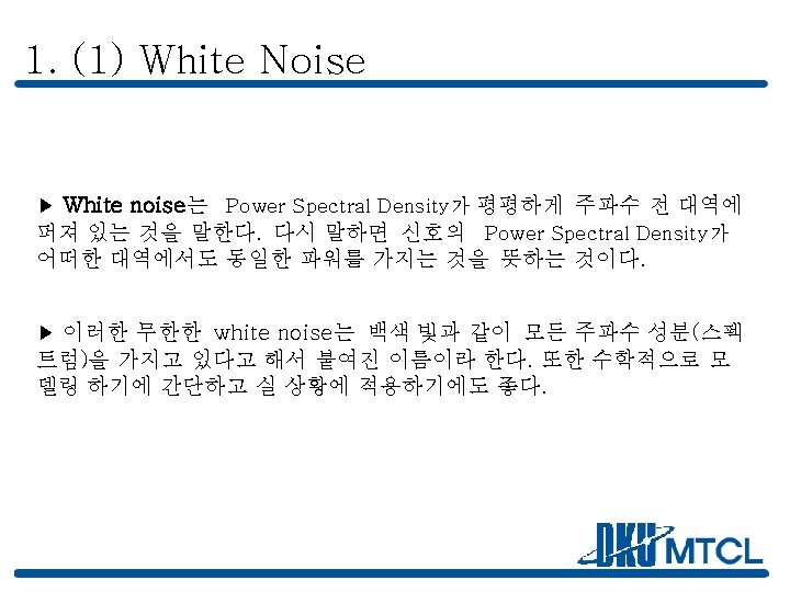 1. (1) White Noise Power Spectral Density Autocorrelation Function {X(t)}의 시간 차 t인 두 시점을 각각 t 1과 t 1+t라 할 때 표 본값의 곱의 집합 평균 ( Y(t 1, t 1+t)=E(X(t 1) X(t 1+t)) ) 를 {X(t)}의 자기상관함수