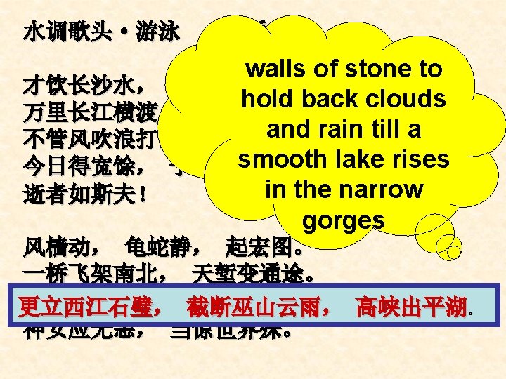 Task 1: Read Part 1 (para 1 & 2), then fill in the blanks in which he Mao Zedong wrote a poem _______ dreamed of “walls of stone to _____ hold back clouds and rain till a smooth lake rises in the narrow gorges”. Now his dream has _____. come true Three Gorges Dam, _____ which is the biggest construction project in China ____ the Great Wall and the Grand Canal, since has been completed now. The dam is nearly 200 meters ____. high and 1. 5 kilometers wide