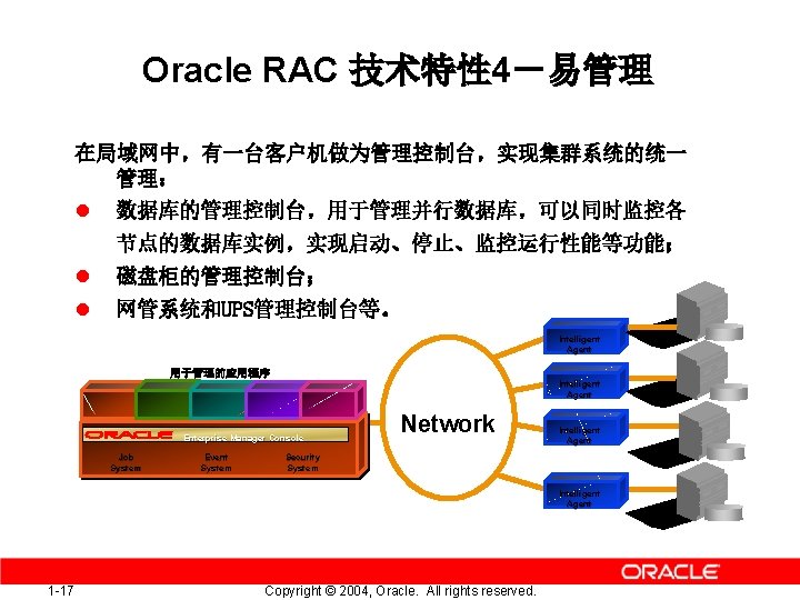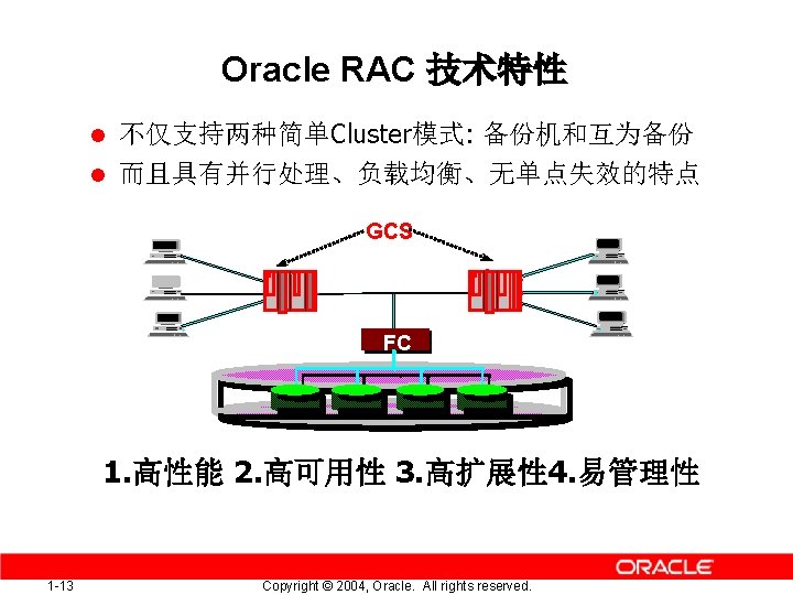 Oracle RAC 技术特性 3-易扩展 具有高度的可扩展性 Node A Node B Node C 节点 C & D 加入OPS/RAC集群, 最大可扩展到个?节点 1 -16 Copyright © 2004, Oracle. All rights reserved. Node D