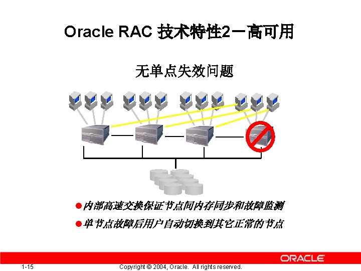 Oracle RAC 技术特性 1-高性能 负载均衡/并行处理 LAN High Speed Interconnect Fiber Channel or Shared SCSI Single Database l 大用户量的并发访问分担到多台节点机上并行处理 l 单个用户重负载的运算分担到多个节点机上做并行处理 1 -14 Copyright © 2004, Oracle. All rights reserved.