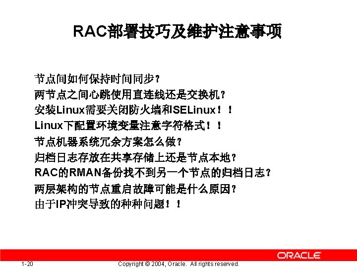纲要 Oracle RAC 原理简介 RAC部署技巧及维护注意事项 1 -19 Copyright © 2004, Oracle. All rights reserved.