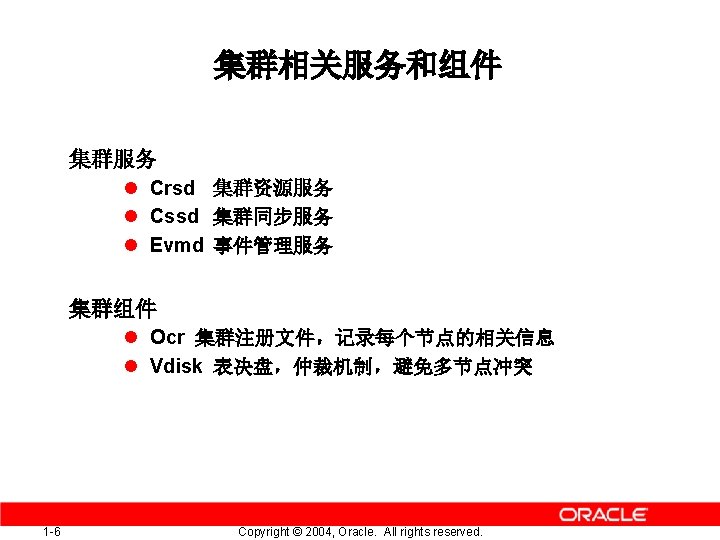 纲要 Oracle RAC 原理简介 RAC部署技巧及维护注意事项 1 -2 Copyright © 2004, Oracle. All rights reserved.