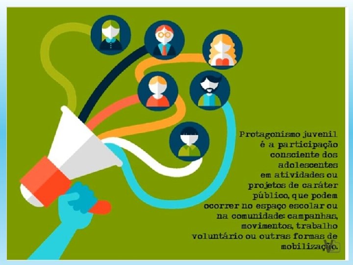 “Protagonismo juvenil é a participação do adolescente em atividade que extrapolam os âmbitos de seus interesses individuais e familiares e que podem ter como espaço a escola, os diversos âmbitos da vida comunitária; igrejas, clubes, associações e até mesmo a sociedade em sentido mais amplo, através de campanhas, movimentos e outras formas de mobilização que transcendem os limites de seu entorno sócio comunitário ” (Costa, 1996: 90)