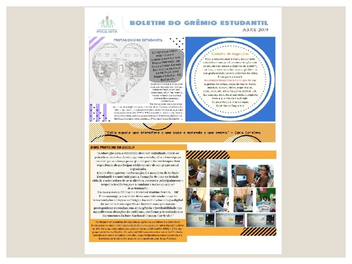 JORNAL ESCOLAR Um Jornal Escolar precisa de boas ideias e muita organização. Nele devem constar textos sobre vários assuntos que envolvam sua escola: desde as atividades em sala de aula até as extraclasses, como comemorações, passeios, feira de ciências, atividades culturais e de lazer.