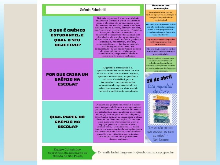 POR EXEMPLO: Se o Grêmio destaca a necessidade de contribuir para o fluxo escolar e propõe uma campanha de permanência escolar e os alunos, por sua vez, querem que o Grêmio organize um campeonato de futebol?