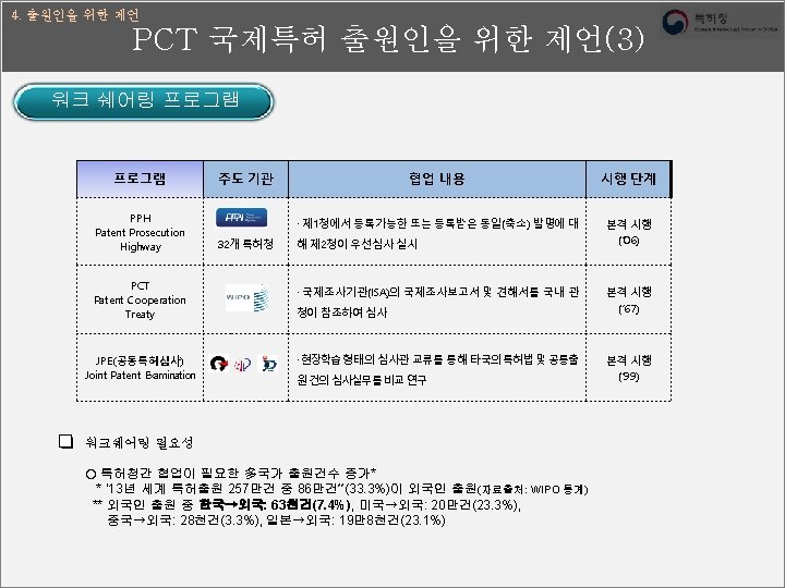 3. PCT 국제조사 업무의 경쟁력 KIPO PCT 국제조사업무의 경쟁력(정리) 비용 COST Reasonable 품질 QUALITY TIMELINESS Good Ave. 2. 55. Month Execellent