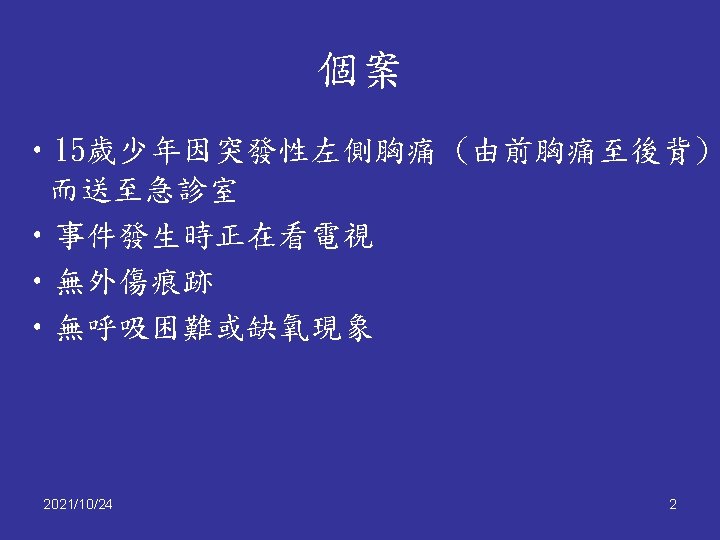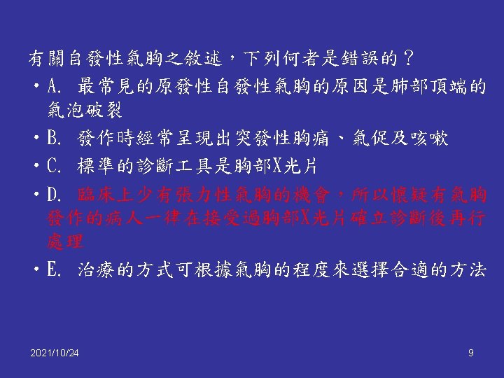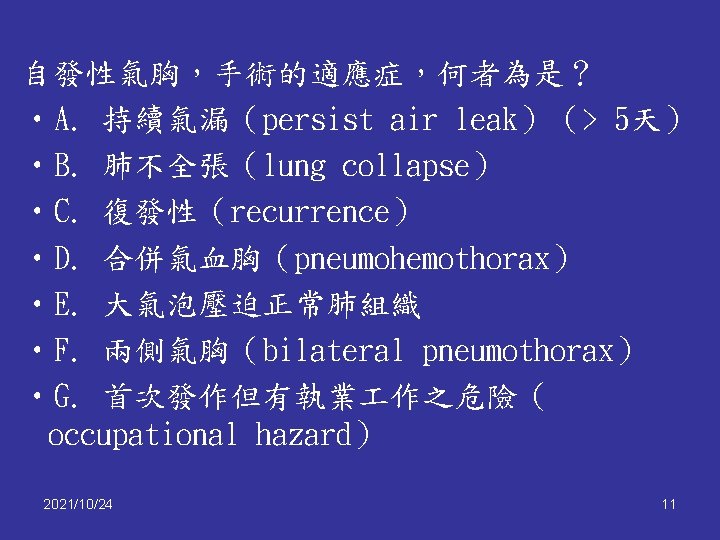 下列何者為自發氣胸之最常見原因: • A. TB • B. Small bleb破裂 • C. Emphysema • D. Lung cancer • E. Endometriosis 2021/10/24 10