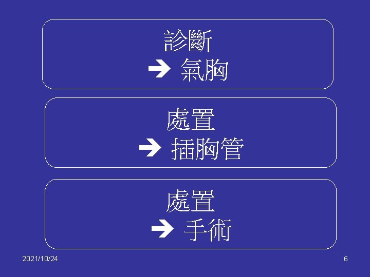 • More than 1, 500 m. L of blood immediately evacuated by tube thoracostomy. • Persistent bleeding from the chest, defined as 150 m. L/h to 200 m. L/h for 2 hours to 4 hours. • Persistent blood transfusion is required to maintain hemodynamic stability. 2021/10/24 24
