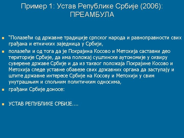 PODZAKONSKI AKTI n n Moraju biti u skladu sa ustavom i zakonima. Razrađuju odredbe zakona u cilju njihove lakše primene i uređuju značajna područja društvenog života. n Donosi ih vlada i organi izvršne vlasti. n Vrste: uredbe, rezolucija, preporuke, odluke, itd.