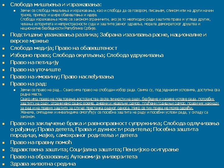 PRAVNE GRANE kao sastavni delovi pravnog sistema JAVNO PRAVO n n USTAVNO PRAVO- pravne norme koje regulišu organizaciju državne vlasti, osnove društveno-ekonomskog uređenja države i osnovna ustavna prava i onabeze građana; UPRAVNO PRAVO- pravne norme koje regulišu organizaciju i nadležnosti države i javne uprave i njihove delatnosti (servis građana). n n KRIVIČNO PRAVO- norme kojima država štiti svoje vitalne interese i osnovne kulturne i opšte prihvaćene ljudske i civilizacijske vrednosti. Država definiše koja ponašanja predstavljaju nedozvoljene (opasne i protivpravne) radnje- krivična dela i propisuje adekvatne sankcije. PROCESNO (SUDSKO) PRAVOreguliše rad sudova i postupak pred njima PRIVATNO PRAVO n GRAĐANSKO I POSLOVNO (PRIVREDNO) PRAVO- norme koje regulišu imovinske odnose. n RADNO PRAVO- norme koje regulišu prava i obaveze u pogledu radnih odnosa. n PORODIČNO PRAVO- norme koje regulišu prava i obaveze u pogledu porodičnih odnosa, pre svega supružnika i dece. n NASLEDNO PRAVO- reguliše prava, obaveze i način prenosa imovine nakon smrti jednog lica na njegove naslednike.