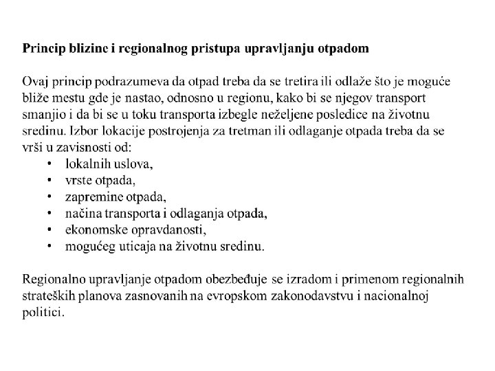 9. Ključni principi upravljanja otpadom Ključni principi koji se moraju uzeti u obzir prilikom uspostavljanja i implementacije plana upravljanja otpadom su: I. Princip održivog razvoja; II. Princip hijerarhije u upravljanju otpadom; III. Princip predostrožnosti; IV. Princip blizine i regionalni pristup upravljanju otpadom; V. Princip izbora najoptimalnije opcije za životnu sredinu; VI. Princip zagađivač plaća; VII. Princip odgovornosti proizvođača.
