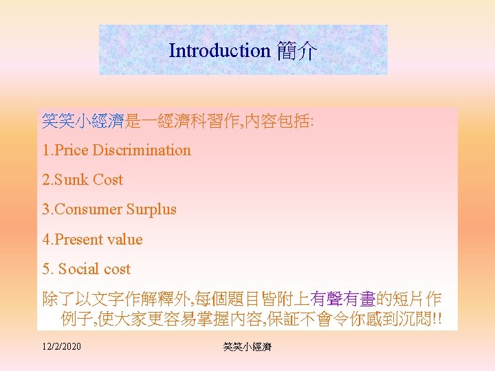 2. Sunk Cost • Cost is the highest-valued option forgone. Sunk Cost • “Bygones are bygones”. Money already spent and cannot be recovered are call SUNK COST. As such, sunk cost may differ from the current opportunity cost. • Because we involve neither current nor future costs, sunk cost should have no influence on deciding what is currently the most profitable things to do. In other words, it is irrelevant to any present or future decision making. Hence, SUNK COST is NOT a cost. 12/2/2020 笑笑小經濟