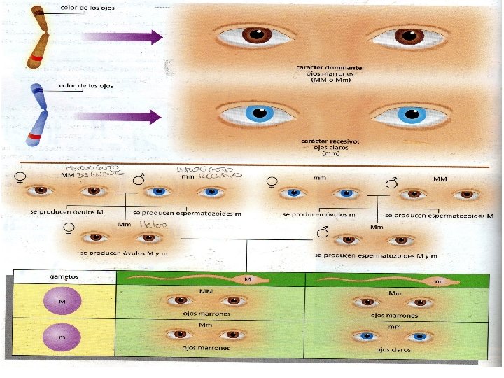 Los genes y la herencia – Los seres vivos diploides (2 n) poseen en cada una de sus células dos copias de cada gen (una en cada cromosoma homólogo del par, del padre y de la madre) – Alelo: cada una de las diferente variantes de un gen (gen ojos azules/gen ojos marrones) – Normalmente un alelo domina sobre otro, y el que domina es el que se manifiesta. (A>a) – Homocigótico: si posee los dos alelos iguales para ese gen (AA o aa) – Heterocigótico: si posee los dos alelos diferentes para ese gen (Aa)