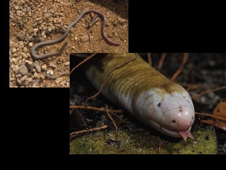 • 26. Suborder Amphisbaenia (worm lizards) –They are specialized burrowers that live in Africa, South America, and the Caribbean. –Most have no legs.