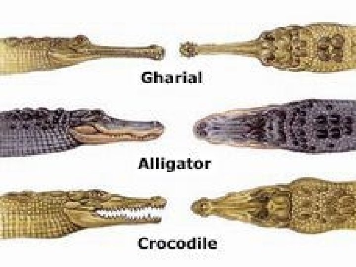 • 27. ORDER CROCODILIA –Living members include alligators, crocodiles, caiman, and gavials. –The snout is elongated and used to capture food by a sideways sweep of the head.
