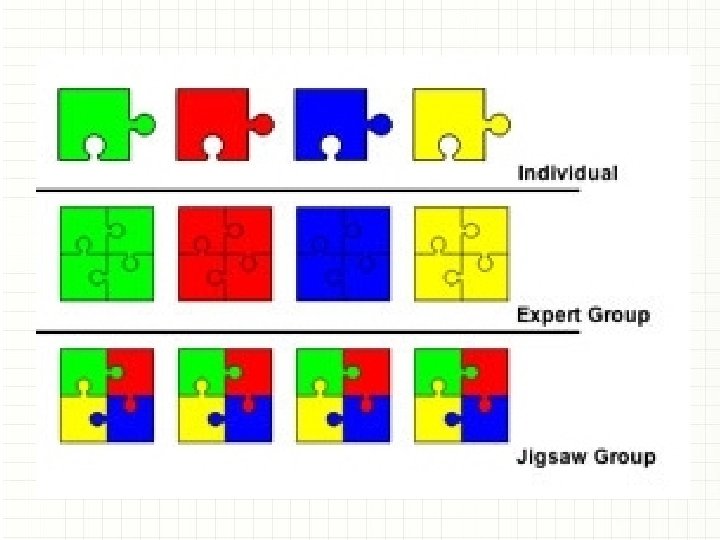 Ayrılıp Birleşme Tekniği (Jigsaw) • Öğrenilecek konu sayısı kadar üyeden oluşan heterojen gruplar oluşturulur. • Öğrenilecek konular her gruba dağıtılır. • Grupta her üye bir konu seçer. • Her gruptan aynı konuyu seçen üyeler bir araya gelerek yeni gruplar (uzman grup) oluşturulur. • Yeni gruplarda üyeler seçtikleri konuda “uzman”laşırlar. • Katılımcılar ilk gruplarına geri dönerler ve her katılımcı uzman olduğu konuyu grup üyelerine açıklar/öğretir. Grup üyeleri uzmana sorular yönelterek konu kapsamlı bir biçimde tartışılır.
