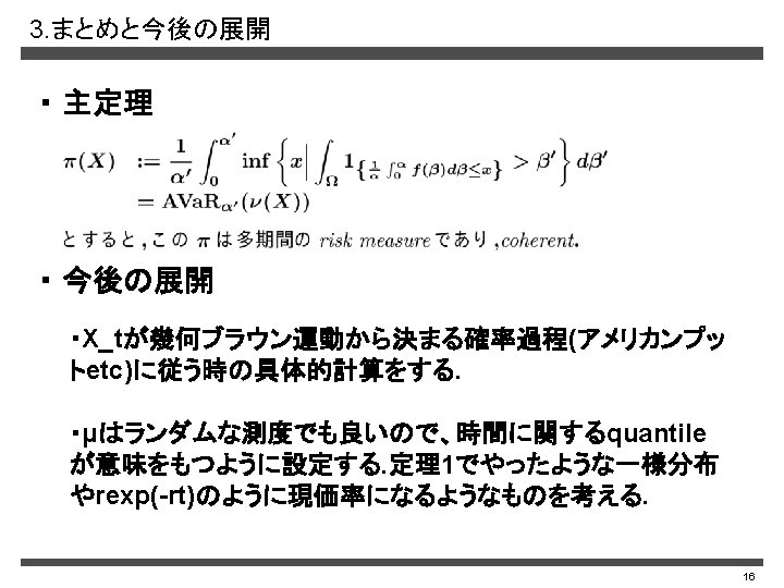 1 risk measure coherent 1 1 risk measure Slides: 17 Download presentation 1. 一期間のrisk measure ・coherent性 1 1. 一期間のrisk measure ・表現定理(Artzner, Delbaen, Eber, Heath(1999)) ・law-invariant性 2 1. 一期間のrisk measure ・risk measureの例 ・各性質の有無(c. f. Kusuoka(2001), Fritteli(2005)) coherence Law-invariance × ○ △ ○ (分布関数が連続の時のみ) ○ ○ 3 2. 多期間のrisk measure ・ coherent性(離散時間) ・ 定理(ADEH(2002)) 4 2. 多期間のrisk measure ・ 例( c. f. ADEH(2002)) 2. 多期間のrisk measure ・ 定理1 Ex) 0 1 2 3 6 2. 多期間のrisk measure ・ 定理1 7 2. 多期間のrisk measure ・ 補題1 8 2. 多期間のrisk measure ・ coherent性(連続時間) 9 2. 多期間のrisk measure ・ 定理2 10 2. 多期間のrisk measure ・補題2 11 2. 多期間のrisk measure ・ 補題3 12 2. 多期間のrisk measure 13 2. 多期間のrisk measure 14