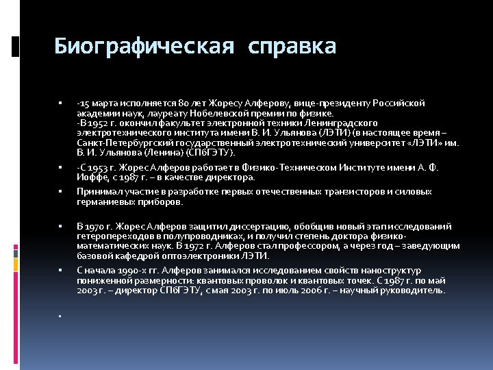 . 1 S. I. Alfjorow Ist am 15. März 1930 in der Belarussisch-jüdischen Familie von Iwan Karpovitsch Alfjorow und Anna Wladimirowna Rosenblum. geboren. 2. Im Jahr 1970 verteidigte Alfjorow Dissertation, fasst die neue Phase der Forschung гетеропереходов in Halbleitern, und Doktor der physikalisch-mathematischen Wissenschaften. 3. Im Jahr 1972 Alferov wurde er Professor, ein Jahr später der Leiter der Basis-Lehrstuhl für Optoelektronik-LETI. Seit Anfang der 1990 er Jahre Alferov untersucht die Eigenschaften von Nanostrukturen reduzierter Dimension: Quanten-Drähte und quantenpunkte. 4. Von 1987 bis Mai 2003 - Direktor zdf. de-Startseite Ihnen. A. F. Joffe. 5. Im Jahr 2003 verlies Alferov den Posten des zdf. de-Startseite Ihnen. A. F. Joffe in Zusammenhang mit dem erichen der Altersgrenze (75 Jahre) 6. Seit 1988 (Gründung) der Dekan des physikalisch-technischen Fakultäts der Polytechnischen Universität. 7. In den Jahren 1990 -1991 - Vize-Präsident der Akademie der Wissenschaften der Ud. SSR, der Vorsitzende des Präsidiums des Leningrader Science Center. 8. 2003 - der Vorsitzende der Forschungs -, Bildungs-Komplex «St. Petersburg physikalischtechnische Forschungs-und Bildungs-Zentrum» RAN.