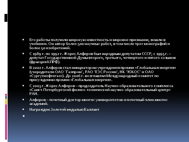 10. War der Initiator der Einrichtung im Jahr 2002 der Auszeichnung «Global Energy» , die er bis 2006 leitete. Es wird angenommen, dass die Vergabe dieses Preises selbst Алферову im Jahr 2005, ist einer der Gründe verlassen Sie diesen Beitrag. 11. Alfjorow Ist der Rektor, der Veranstalter der neuen Akademischen Universität. 12. Am 5. April 2010, ernannte Alfejorov wissenschaftliche Leit ung des Innovationszentrums in Skolkovo 13. 1995 -2007 - der Abgeordnete der Staatsduma der föderalen Versammlung der Russischen Föderation 2, 3 , 4 Einberufung von der kommunistischen Partei, Mitglied im Ausschuss für Bildung und Wissenschaft. 14. Alfjorow ist Nobelpreisträger - «Für die Entwicklung der Halbleiter гетероструктур für Hochgeschwindigkeits-und Optoelektronik» , (Schweden, 2000); 15. . Er wurde mit dem Orden der Ud. SSR fur der Ehre (1959), des roten Banners der Arbeit (1975), der Oktoberrevolution (1980), Lenin (1986) , sowie Auszeichnungen der Russischen Föderation «Für Verdienste vor dem VATERLAND» (I - III Grad (1999 - 2005) ausgezeichnet.