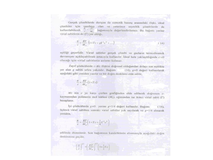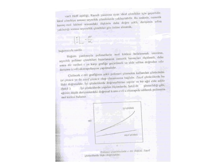 Ozmotik basınç-mol kütlesi ilişkisi Ozmotik basınç ve çözeltideki polimerlerin mol kesri(xp) arasındaki ilişki, çözücünün kismi molar hacmi V 1 olmak üzere, şeklindedir. Seyreltik çözücülerde xp çok küçük olacağından dolayı, yaklaşımları yapılır. Bu iki yaklaşım bağıntı, ilk bağıntı kullanılarak van’t Hoff eşitliği olarak bilinen aşağıdaki ilişki elde edilir.