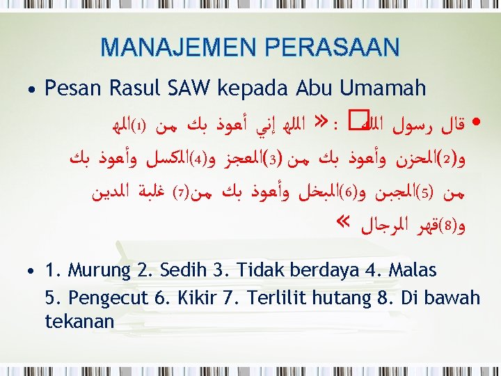 MANAJEMEN PERASAAN 1. Murung & Sedih >> mengurung potensi hebat yg Allah karuniakan kepada setiap makhluk-Nya tanpa terkecuali dan sebabkan sempitnya hati �dzikir 2. Tidak berdaya & Malas >> membunuh kreativitas & produktivitas serta mengakibatkan bersikap mudah menyerah thd setiap tantangan, cenderung negative thinking �optimis & cari motivasi 3. Pengecut & Kikir >> menggerus tanggungjawab & pupuk egoistik �bersedekah 4. Terlilit hutang >> akibat gaya konsumerisme �qonaah & sederhana & miliki prioritas 5. Di bawah tekanan >> karena hutang jasa atau ditakut-takuti �mandiri, iffah & kebersamaan dg orang-orang shalih